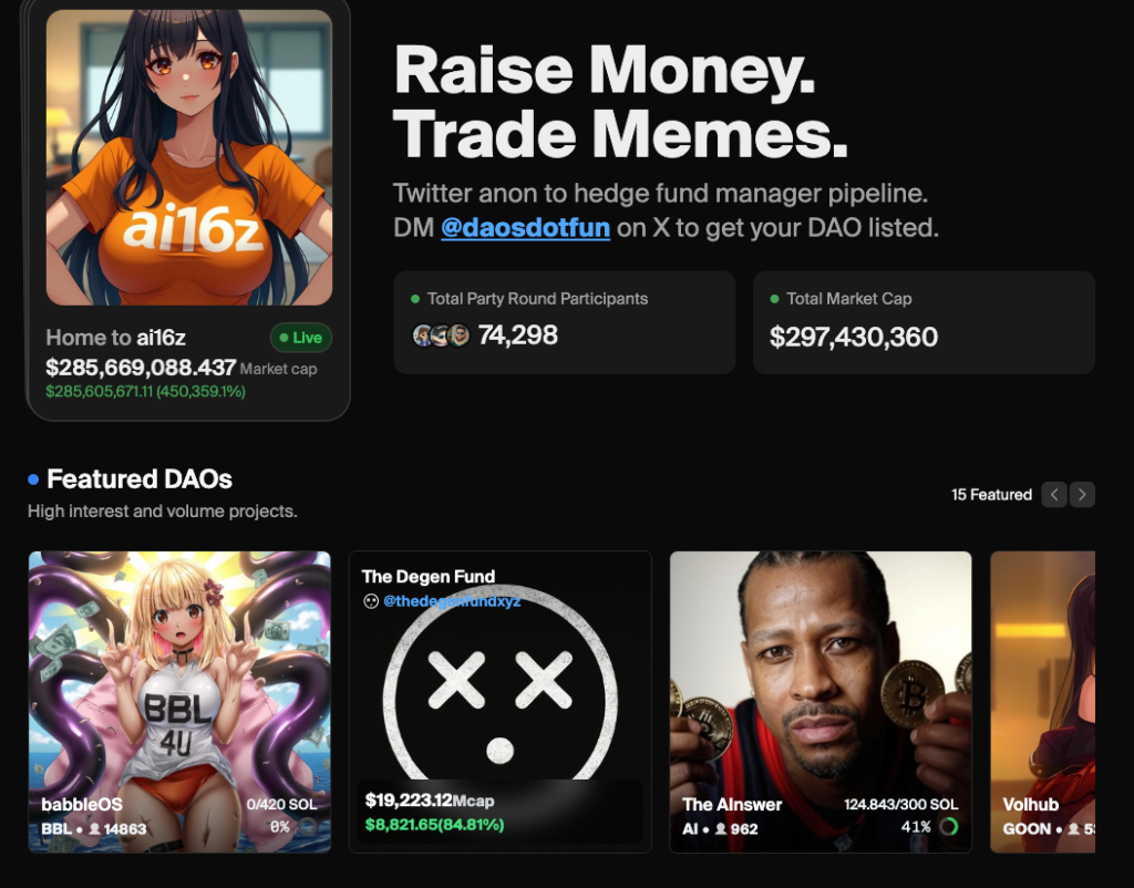 - Het AI16Z -fonds wordt gelanceerd als een satirische knipoog naar Andreessen Horowitz en gebruikt AI om de handelsstijl van Marc Andreessen na te bootsen. Ondanks zijn humoristische oorsprong heeft het een aanzienlijke marktactiviteit bereikt, aangedreven door speculatieve handel en gemeenschapsbetrokkenheid op platforms zoals X (SolanaFloor). Het succes onderstreept Daos.Fun’s vermogen om van de internetcultuur om te zetten in levensvatbare investeringsmogelijkheden.