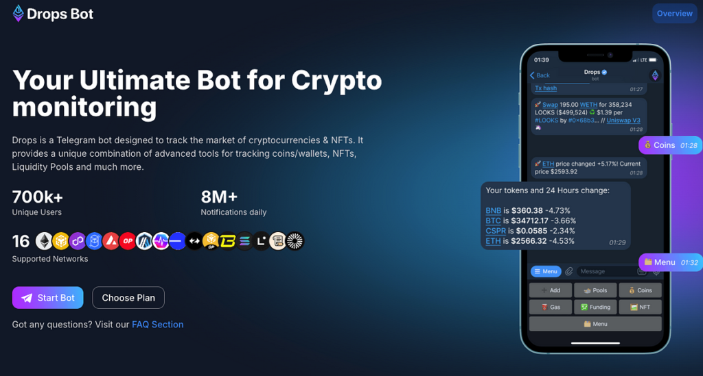 Drops Bot is een krachtige Telegram -bot die is ontworpen voor het volgen van cryptocurrency- en NFT -markten. Het is gelanceerd in 2018 door DropStab en bedient meer dan 700.000 gebruikers en verzendt meer dan 8 miljoen dagelijkse meldingen. In tegenstelling tot tools gericht op het volgen van airdrops, zet BOT -monitors munten, portemonnee -transacties, NFT’s en liquiditeitspools in 16 blockchain -netwerken, waaronder Ethereum, Binance Smart Chain en Solana. Toegankelijk via Telegram op https://t.me/drops, biedt het een naadloze, mobiel-vriendelijke manier om op de hoogte te blijven van marktactiviteiten.