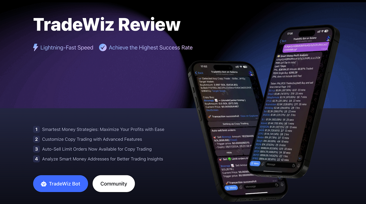 Tradewiz Bot is een op Telegram gebaseerde handelsbot op maat voor het Solana-ecosysteem. Het kernaanbod is copy -handel, waarbij gebruikers automatisch de transacties van succesvolle “Smart Money” -portefeuilles kunnen repliceren. Met transactiesnelheden die op een indrukwekkende 1,1 tot 2,1 seconden worden ingedrukt, wordt het op de markt gebracht als een van de snelste bots die beschikbaar zijn, waardoor handelaren een voorsprong op de crypto-markt met high-stakes hebben. Of u nu een beginner bent die uw tenen doopt in Solana Trading of een doorgewinterde pro op zoek naar automatisering, Tradewiz wil uw strategie vereenvoudigen en optimaliseren.